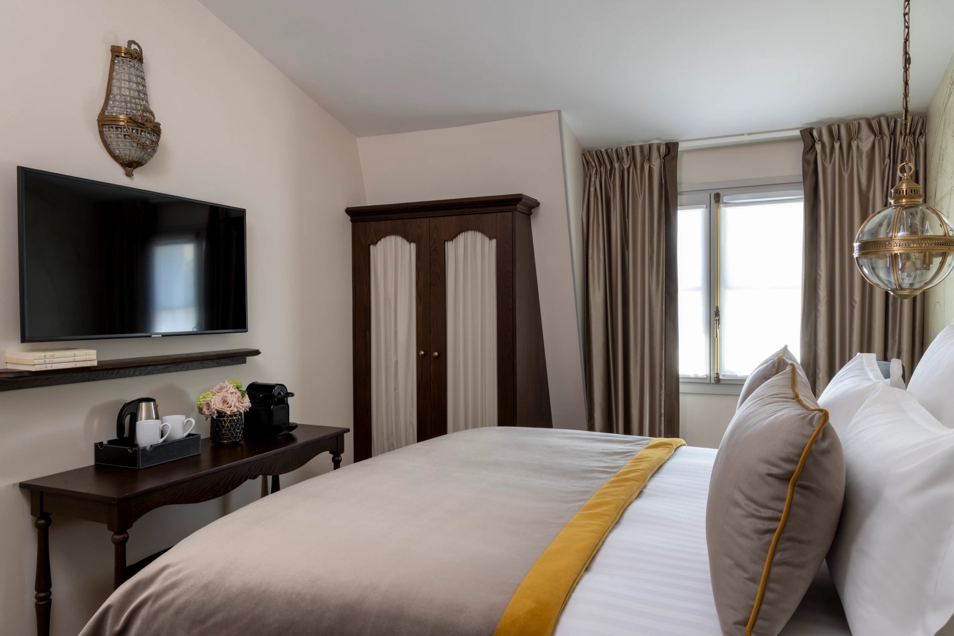 Plus spacieuse, la Chambre Supérieure allie élégance, confort moderne et atmosphère feutrée. Elle est parfaite pour une escapade en amoureux à Paris.